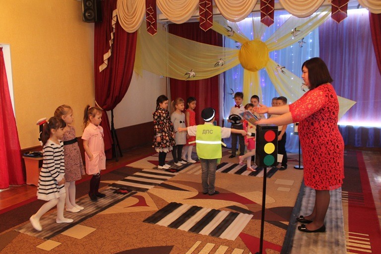 На импровизированном перекрёстке воспитанники детского сада "Чебурашка" повторили правила перехода через проезжую часть дороги, основные дорожные знаки, виды светофоров и их сигналы.